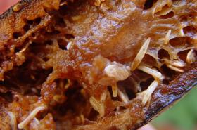 Fruit fly maggots in watermelon fruit, the larvae are about 1cm long © A.M. Varela, icipe |