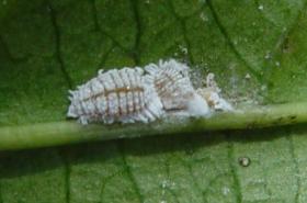 Female mealybugs on passionfruit leaf. Female mealybugs are 3 to 5 mm long and their body is usually covered with a waxy secretion. © A.M. Varela, icipe |