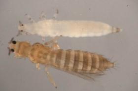 Thrips are small (1.5 mm long), slender, brown insects with pale yellow hind wings that appear as a yellow line down the back of the body when the insect is at rest. Adult thrips have characteristic wings; the transparent wings have a fringe of hairs around the outside edge standing out in the same plane as the wing.