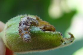 The damage is done by the larva which bores holes into pods of all sizes. It produces a mass of frass held together by silk at the entrance of the holes. If the pod is very young and soft (cherelle) then it wilts. The insect is usually not controlled.