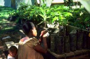 Cocoa is usually planted as seedlings, which are easy and cheap to produce. Vegetative propagation by rooted cuttings or budding is used to establish seed gardens. Seedlings are usually raised in polythene bags in a shaded nursery. Young plants are planted in the field 3 - 4 m apart or about 1100 trees/ha at an age of 4 - 6 months. Young trees need shade to reduce irradiance, to buffer the microenvironment and to promote the right shape and habit of the trees. When a closed canopy has been formed, the need for shade is reduced. Only under most favourable conditions of soil and nutrient supply can cocoa be grown without shade. It is normally necessary to retain some shade to reduce moisture stress and incidence of insect damage in order to prolong the economic life of plantations.