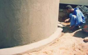 Step 5The next day another coat of mortar is added until all binding wires and chicken mesh are covered with mortar. Within the same day, cement slurry (NIL) is pressed onto the moist plaster with a square steel trowel for water proofing. The outside of the tank can be painted with a weatherproof paint made of 1 part cement to 10 parts of lime mixed with water.