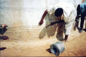 Step 3 A second person presses chicken mesh against the wall and uses the two ends of the U wire to tie to chicken mesh tightly against the wall. Thereafter chicken mesh is laid on the floor of tank.