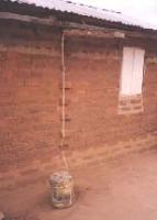 A sheet of metal or of polythene or a length of split Bamboo or Sisal pole is tied to the roof. A rope hangs from the gutter to facilitate rainwater running along the rope into a 20 litres jerry can on the ground.