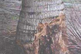 A putrid basal soft rot of the newly emerged spear (youngest leaf) occurs once foliar yellowing is advanced. Spear leaf collapse and rot of the apical meristem invariably precedes death of the palm at which point the crown topples away leaving a bare trunk. Infected palms usually die within 3 to 6 months after the appearance of the first symptoms.