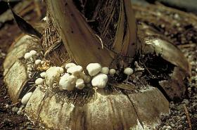 Fungal bodies (like small mushrooms) commonly occur on exposed roots, leaf bases of seedlings, exposed tops of seed nuts and on the soil surface around holes (growing from coconut debris) where diseased palms had been removed 2 years previously. On average, there is only about 8 weeks from the time of onset of symptoms till the death of the palm; this interval depends on the extent of fungal decay in the bole.