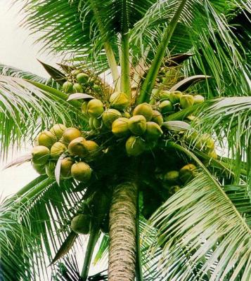 The coconut palm is an important tree in most tropical islands and along the coastal regions of tropical Africa. It is a multipurpose tree. Every part of the coconut palm can be used. The juice from the inflorescence, which can contain up to 15% sugar, is used to make palm-wine. Half-ripened nuts (6-7 months old) are often eaten fresh. The juice can be drunk, and milk is squeezed out of the meat (endosperm). Fully ripened nuts (after 11-12 months) provide the so-called copra, which is made from the firm meat of the nut.