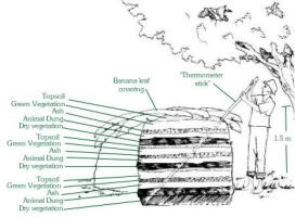 11. To complete the pile, cover it all over with a layer of topsoil about 10 cm (4 inches) thick. This layer prevents plant nutrients from escaping from the compost pile. Lastly, cover the whole with dry vegetation such as banana leaves to reduce moisture loss through evaporation.