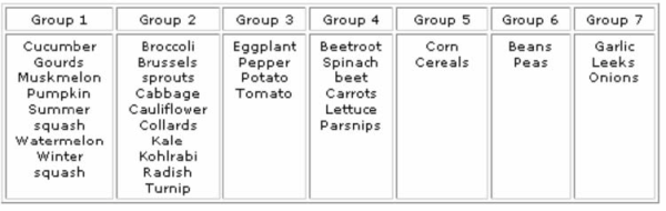 The table below indicates which crops are in the groups that suffer from the same pest and disease problems and which should therefore not be planted in rotation.