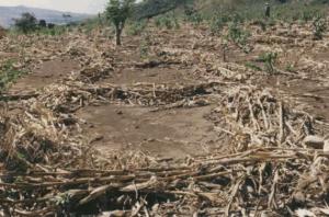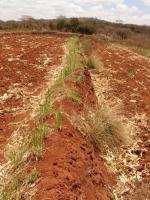 | Fanya juu bund in maize field after harvest. Note napier grass strip on upper part of bund, and maize trash in ditch below. |