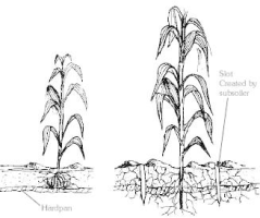 | Minimum tillage effects: Maize grows better where subsoiling and ripping have broken the hardpan (right) than previously (left) |