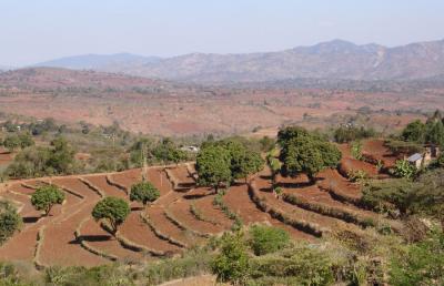 | Fanya juu terraces in a semi-arid area which have developed over time into benches. Note the well established grass strips along the bunds. |