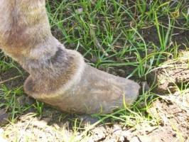 Inspect a donkey's hooves daily and take care of them. A donkey.s hoof should be short and upright with an oval bottom. If the toe becomes long and slanted, it should be trimmed. Excess hoof wall, as well as ragged loose pieces of frog, can be removed with a sharp, strong knife. Cracks and chips in the wall can spread, and eventually destroy the entire hoof. Coating them daily with oil or grease may help hooves that are very dry or brittle, badly cracked or broken. This prevents them from further dehydration and assists healing.