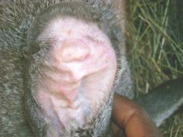 This is not quite as common. It is caused by one of two species of mites: Sarcoptes cuniculi and Notoedres cuniculi. The mites burrow into the skin causing intensive irritation. Scratching will cause open sores. If the disease is not treated the animal is sure to die within a few weeks.