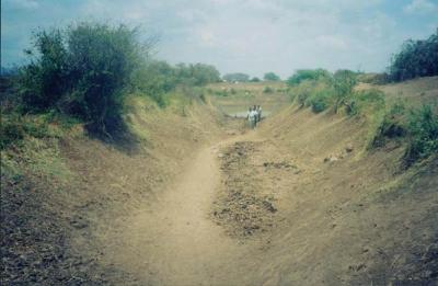 The curved heap of soil, shown above, will become the dam wall, while the excavated pit will be the water reservoir. The size of the dam wall and its reservoir depends on the capacity to remove soil from the reservoir and placing it on the dam wall. The gradient (slope) of the sides of the dam wall should be 2:1, which is 2 m width for every 1m of height.