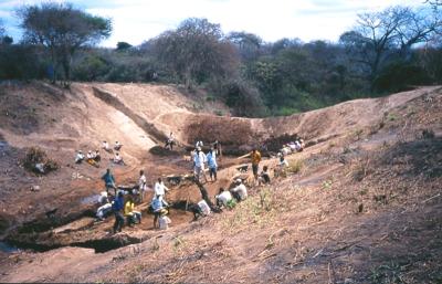 Farmers and cattle owners in semi arid parts of Tanzania build small earth dams known as Charco, or Milambo in Kiswahili. These dams are built in a way, which tries to reduce evaporation losses by deepening the water reservoirs and minimising their surface area. Trees and shrubs are grown on the windy site of the charco dams to function as windbreaks and reduce evaporation.