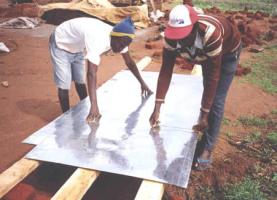 Cut galvanized plain iron sheets of gauge 26 or 28 into three strips, each being 200 cm long and 33.3 cm wide by marking the sheets with a thick wire, about 40 cm long, with each end having a sharp bend and a pointed end to scratch a line. The distance between the two bends must be 33.3 cm in order to make equal width of the cut sheets.
