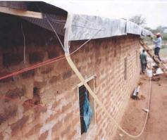 The best known gutter is semi-circular and made either of galvanised iron sheet or PVC. Gutters are laid in gutter brackets nailed onto facia-boards or in V-shaped tree branches nailed to the rafters with a gradient sloping towards the water tank. Bamboos and Sisal poles can also be used as gutters when split in two halves.