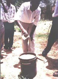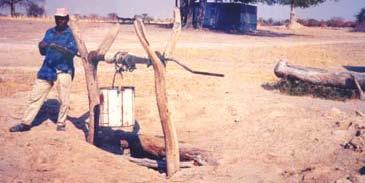 The oldest and simplest method is to dig a waterhole in a riverbed and use a calabash cut in half to scoop water into a calabash or a jerry can. |