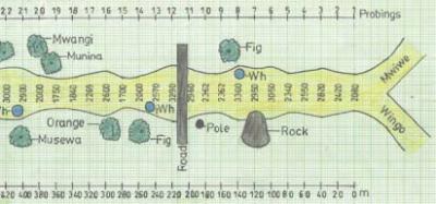 | The plan shows that the probed river has a length of 440 m and width varying from 17.5 m to 33.0 m. Water-indicating trees, e.g. Figs, Mwangi and Munina, grow along the riverbed. Waterholes having water 7 months after the last rains were located at probing