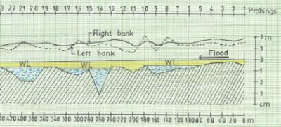 downstream dykes at points No. 11, 18 and 23, as see on the longitudinal profile on the right. The longitudinal profile shows that the sand is 3.0 m deep at point No. 14 and 1.75 m deep at point No. 21. Since both places are holding water 7 months after the last rain they are the best extraction points in that part of Mwiwe riverbed. The next phase in surveying the riverbed was to probe across at point No. 17 in order to learn of the volume of the depression and its water yielding capacity. |