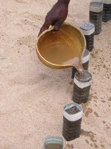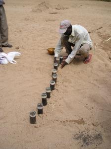 How to identify the most clayey soil: 1) Collect soil samples from nearby riverbanks and fields. The equipment for analyzing the soil samples consists of plastic bottles of equal size, of which the caps have been removed and the bottoms cut off. 2) The bottles are placed upside down in the sand, or sloping against a wall, and filled halfway with soil samples. 3) Water is poured on top of the soil samples several times. After some minutes it can be observed which soil sample has the slowest infiltration rate due to having the highest clay content. This soil is the most suitable for building the dam wall. |