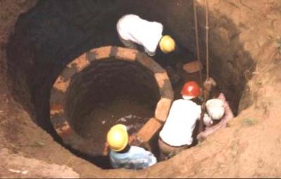 Well shafts can be lined with burnt bricks when built upwards from the bottom of hand-dug wells. However, this procedure is risky because collapsing soil can bury the builders alive. |