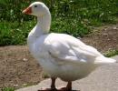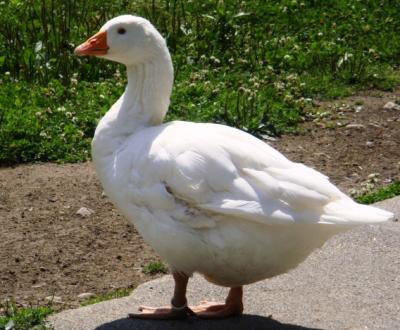 The Embden is a white goose with relatively tight feathering, an erect stand, orange shanks and an orange beak. Most strains of Embden can be sexed on the down colour of the goslings, as males are a lighter grey than females. This difference is evident until the goslings are two to three weeks of age. The breed has been relatively popular for many years in both Europe and North America. It is one of the larger breeds with males weighing up to 10.0 kg and females up to 9.0 kg. It has a moderate egg production producing 40 eggs per year with an egg size of 170 g. The Embden is suitable for heavy type meat production but is probably of more value when used as a male line in the production of a crossbred commercial goose.