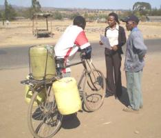 A bicycle vendor buys water for Ksh 3 per jerry can and sells it for between Ksh 6 and Ksh 10 per jerry can depending on the distance he has to deliver the water. The average income for bicycle vendors varies from Ksh 150 to Ksh 300 per day. Although a hand-cart vendor can carry many more jerry cans of water than a bicycle their transport is slower and heavier. |