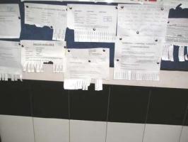 | The uneven ears seen on the notices pinned to the notice board are strips of papers with telephone numbers which can be pulled off by interested persons who want to phone for further details at a later stage. |