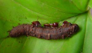 | Ants attacking a cutworm caterpillar. |