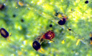 | A predatory mite (Phytoseuilus persimiles) (red) feeding on spider mites |