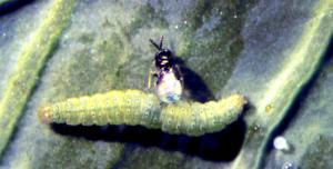 | Parasitic wasp Oomyzus laying eggs in diamondback moth caterpillar |