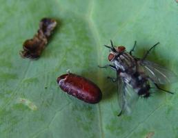| Tachinid fly , a parasitoid of caterpillars. Note brown fly puparium and dead caterpillar. |