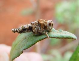 Description: The most important are tachinid flies. The adults look like the common house flies, but are larger (8-12 mm in length) and have more stout, bristly hairs on the abdomen. They are usually grey in colour with some markings. Female flies lay tiny whitish oval eggs on their host, and sometimes on leaves. Upon hatching the fly larvae (maggots) burrow through the body and feed on the prey. With species that lay eggs on leaves, eggs are ingested by caterpillars or larvae of beetles while feeding on foliage. Pupation occurs either within or outside the body of the host. Some species pupate in the soil. Adults feed on nectar and pollen.