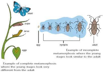 monkeys and even hippos.Life stages of arthropods Arthropods can look very different at different stages in their life cycle. It is useful to understand these different forms so that pests can be identified regardless of the stage they have reached in their life cycle. Arthropods go through a process called metamorphosis which means change of form. Some have complete metamorphosis where the young stages look completely different from the adults - see the butterfly in the left hand picture below. Others go through incomplete metamorphosis where the young look a little like small versions of the adult, but without fully developed wings - see the bug in the right hand picture below.