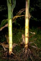 Basal stalk rot caused by Gibberella zeae on maize. Healthy plant on the left and infect plant on the right