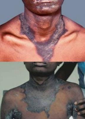 - Dermatitis: red, scaly lesions in sun exposed regions which become darker with time