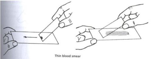 1. Blood smears should be taken. Disinfect a small area at the base of the animal's ear. Prick a small hole with a disinfected needle so that a drop of blood appears. A small drop of blood is then touched with a clean glass slide. With another glass slide touch the drop with one end of the slide until the blood spreads along the angle between the two slides. Then push the upper slide along the length of the lower slide so that it draws the blood after it. Wave the slide in the air and it should dry almost immediately if the smear is of the correct degree of thinness. Place inside a clean envelope. Do NOT stick two smears together. So doing renders both useless for diagnostic purposes.