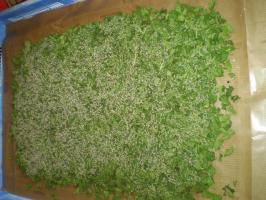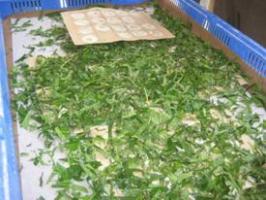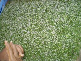 2. Chop tender (2nd and 3rd leaf) mulberry leaves into small pieces approximately equal to the size of the hatched silkworm larvae and sprinkle over the egg card. The hatched silkworms will crawl onto the chopped leaves and start feeding. Later the cards are removed and anz larvae still left on paraffin paper or newspaper are tapped gently onto the rearing bed. When all larvae are on the rearing beds, then the first feeding is given.