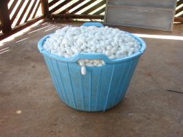 De-flossing - After harvesting all loose fiber on cocoons surface is removed, giving it a clean look, ready for the market. Failure to de-floss cocoons lowers the marketability of the cocoon.