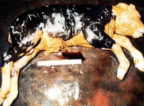 - Post mortem examination of animals which have died of acute trypanosomiasis may show extensive small haemorrhages involving mucous and serous surfaces, areas of emphysema in the lungs and mild gastroenteritis. After more chronic infections, the carcass may be anaemic and emaciated, with an enlarged spleen and lymph nodes.