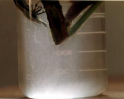 Water test for detection of bacterial wilt. Note bacterial strands oozing from infected tissue.