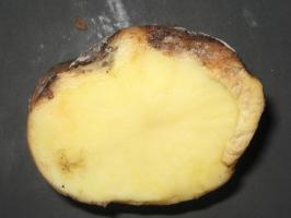 Bacterial wilt of potato: The infested leaves wilt during the (sunny) day and sometimes recover during cool hours. The wilting is similar to the result of lack of water. During the rapid development of the disease, the entire plant wilts quickly without yellowing. Other symptoms could be wilting of only a part of the stem, or one side of the leaf/stem. The stem wilts or dries up completely and the remainder of the plant remains healthy. When the diseased tuber is cut, it shows a browning of the vascular ring and the immediate surrounding tissues On the cut surface, a creamy fluid usually appears on the vascular ring.