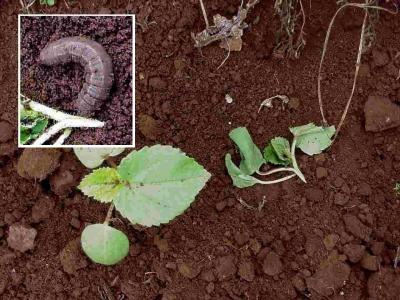 | Okra seedling damaged by cutworm caterpillar (right). Note healthy seedling on the left. Close-up of cutworm (inset) |
