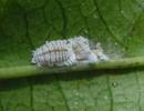 | Mealybug eggs are very small and are laid under a white, loose woolly wax, which remains attached to the abdomen of the females. A female may lay between 50 to 600 eggs. Nymphs. Very small nymphs are flat, oval and yellow. Older nymphs of some species are covered with fluffy, white wax. Older female nymphs resemble the adults, but older male nymphs secrete a tiny, fluffy cocoon, within which they develop into winged adults. Upon hatching young mealybugs, known, as crawlers, are extremely mobile and may disperse over large distances. Older nymphs are more or less sessile. Adult female mealybugs are soft-bodied, elongated, oval insects with well-developed legs. They are about 3 to 5 mm long. Their body is usually covered with a mealy waxy secretion, often extended into lateral and terminal filaments. They are wingless and do not move unless disturbed. They usually remain clustered around the terminal shoots, leaves or fruits. They live for several months (depending on the species). The short-lived males are up to 3 mm long. Male adults have one pair of wings and several pairs of eyes but no mouthparts. Males fly about seeking females to mate with. In many species of mealybugs there are no males and females reproduce without mating. Some species lay eggs, and others give birth to living young. |