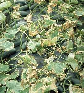 Severe defoliation of cucumber caused by infection from downy mildew. Fruits are not infected, but those that form are small and do not ripen properly.