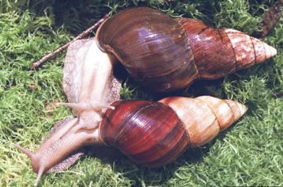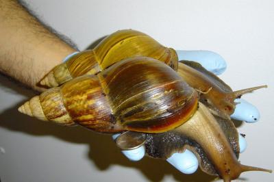 The Giant African Snail (Achatina fulica). Adults of the species may exceed 20 cm in shell length but generally average about 5 to 10cm