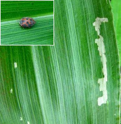 Damage by plant-feeding ladybird beetle on maize leaf. Note close-up of beetle (inset).
