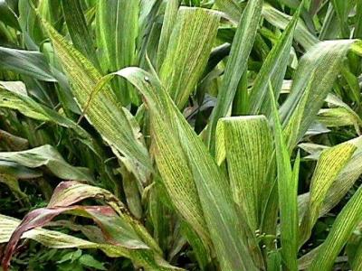 Streaked foliage damage caused by maize leafhopper (Cicadulina mbila)